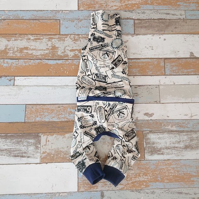 ロゴワッペン柄の生地で、ロングネックのタンクロンパースを作りました。