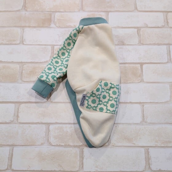 無地の生成りと北欧風のデイジープリントのミニ裏毛生地で薄手のトレーナーを作りました。