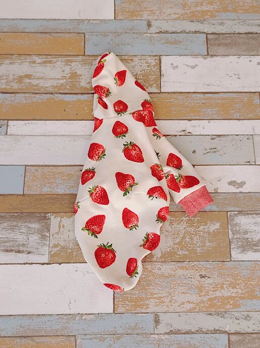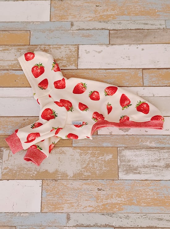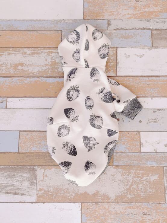 リアルないちごプリントのミニ裏毛生地で前開きスナップのパーカーを作りました。